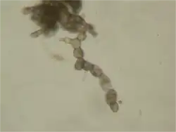 Rychlost růstu mycelia na PDA při 22 °C (UV záření / 320–380 nm) je 9–20 mm za 24 hodin. Primární mycelium má tenkostěnné hyfy, obvykle přes 250 μm dlouhé a 7–10 μm široké před vytvořením první přehrádky. Konidie 8–28 x 5–19 μm velké (nejčastěji 12–16 x 8–11 μm), bezbarvé. [1]