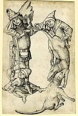 - Divý muž či žena jedoucí na jednorožci (L 465) v kopiích Israela van Meckenem; varianty námětu: Pár divých lidí; Divý muž a medvěd