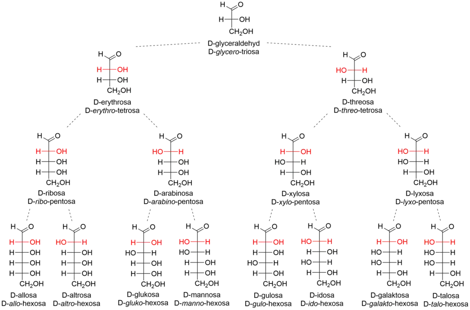 Aldózy a jejich odvození. V každém patře se počet aldóz zdvojnásobuje. Přibude vždy jedno chirální centrum, které je vyznačeno červeně. V jednotlivých patrech jsou hydroxylové skupiny na C2 orientovány střídavě doprava a doleva