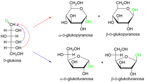 Ve skutečnosti se monosacharidy málokdy vyskytují v lineárních formách. V roztoku existují převážně v cyklických formách a v krystalickém stavu se v těchto formách nacházejí zcela výlučně.[8][9] Cyklická forma monosacharidu vzniká vnitromolekulární reakcí jedné z hydroxylových skupin s karbonylem za tvorby poloacetalového (v případě aldóz) nebo poloketalového (v případě ketóz) uskupení. Tato reakce je analogická tvorbě poloacetalu rovnovážnou reakcí alkoholukarbonylovou sloučeninou, avšak v případě cyklizace monosacharidu reakce probíhá samovolně i bez kyselé katalýzy.[7]