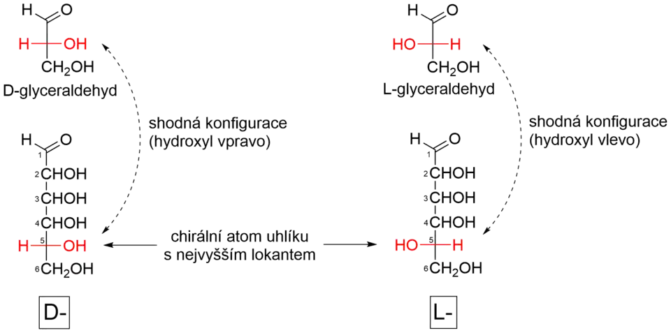 Příklad zařazení aldohexózy do D- nebo L-konfigurační řady. Konfigurace na ostatních centrech než konfiguračním atomu není záměrně vyznačena, protože v tomto smyslu není důležitá