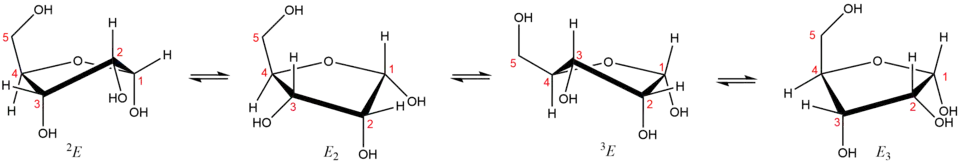Furanosové kruhy jsou konformačně flexibilnější nežli kruhy pyranosové, což je dáno malým rozdílem v energiích jednotlivých konformací. Jednotlivé konformery tedy mohou mezi sebou snadno přecházet a v roztoku se tak i děje. Nejčastější konformací pětičlenných kruhů jsou obálkové konformace (E – envelope).[25][6]