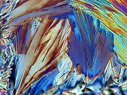 Krystaly D-glukosy zobrazené pomocí mikroskopie Nomarského diferenčního interferenčního kontrastu