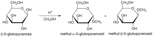 Reakcí anomerní hydroxylové skupiny s alkoholem v kyselém prostředí vznikají glykosidy.[9][32] Tato reakce je analogická tvorbě acetalu z poloacetalu, glykosidy tedy můžeme označit za acetaly monosacharidů. Formálně je v glykosidech nahrazen vodík anomerní hydroxylové skupiny alkyl- nebo arylskupinou. Tuto necukernou část glykosidu nazýváme aglykon. Glykosidace je jedna z nejdůležitějších reakcí monosacharidů a glykosidy jsou v přírodě hojně rozšířeny zejména v rostlinách.