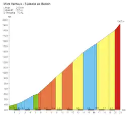 Stoupání z Bédoinu na Mont Ventoux je profesionálními cyklisty považováno za jedno z nejnáročnějších. Průměrný sklon kopce je 7,43 % a současná délka tratě 21 825 metrů.
