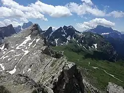 Hřeben Nuvolau se severním úbočím Gusela, vpravo Passo di Giau. V pozadí zleva doprava: Monte Formin (2657 m), Monte Pelmo (3168 m), Monte Cernera (2664 m) a Monte Civetta (3220 m) zahalené v mracích.
