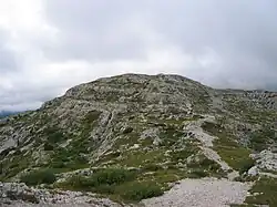 Holý vrcholek Ortigary fotografovaný z Caldiery v polovině srpna. V pozadí Cima XII. -