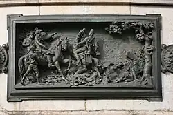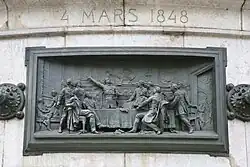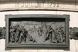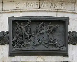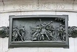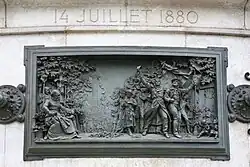 Kamenný podstavec je obklopen dvanácti bronzovými reliéfy, které vytvořil Léopold Morice. Jsou propojeny rozetami a umístěny ve výši očí pro kolemjdoucí. Tvoří chronologii událostí označujících historii Francouzské republiky mezi lety 1789 a 1880:
