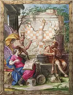 Výjev je v malbě Alegorie šťastné vlády Moravy, která je známá též jako Hold Olympu Moravské zemi, na olejové skice z doby před 1734, která je ve sbírkách Moravské galerie v Brně, popsán takto: „Pod zvěrokruhem, naznačujícím u horního okraje čas věčnosti, letí Fáma s pozounem, hlásající slávu Moravy. Vrchol tvoří symbol země, obelisk se znakem Moravy, šachovanou orlicí. K obelisku přilétají putti s vavřínovým věncem a korunou.“[68][69] [67]