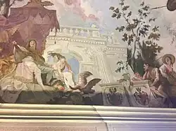 Znak Moravy pojatý v barvách zelené a žluté je namalován na obelisku v horní části stropní fresky jsoucím poblíž Dobré zvěsti (Buona Fama). Spojení Famy s obeliskem v barokní době vyjadřovalo nejvyšší stupeň všeho, co je trvalé a vznešené.