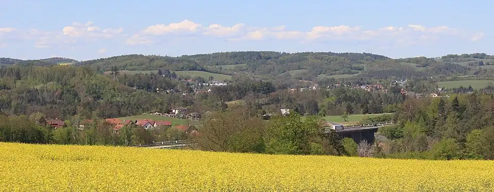 Most přes údolí Šmejkalky – pohled od Lensedel k Senohrabům