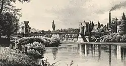 Řetězový most přes Ostravici na litografii Ernsta Wilhelma Knippela z let 1847–1857 -