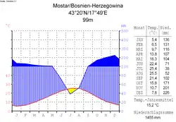 Na rozdíl od značné části měst na území Bosny a Hercegoviny je klima v údolí řeky Neretvy, kde se město Mostar nachází, ovlivněno výrazněji středomořským podnebím. Průměrná roční teplota zde činí 14,6 °C a počet slunečných hodin ročně 2261. Průměrná lednová teplota dosahuje 4,6 °C, průměrná červencová potom 24,6 °C. Vyšší srážky a chladnější teploty jsou typické pro severozápadní a východní okraj města (klima se mění vzhledem k hornatému terénu). Nejvíce srážek spadne v listopadu a prosinci, nejméně (stejně jako jinde na Balkáně) v letních měsících. Průměrný roční úhrn srážek činí v Mostaru 1 572,8 mm. Sněží zřídkakdy i v zimě, sněhová pokrývka zůstává především v okolních horách klidně i několik měsíců. Větry vanou většinou ze severu.