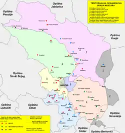 Mezinárodní pomoc se pokoušela kromě obnovy jednotlivých poškozených staveb ve městě také sjednotit místní administrativu. Za války rozdělené město bylo nejprve správně rozčleněno do sedmi obvodů s poměrně širokými pravomocemi (včetně vlastních rozpočtů, pravomocí ohledně stavebního řízení apod.). Jednalo se o tři obvody s chorvatskou většinou, jeden s bosňáckou a jeden centrální, smíšený.[12] Mezi chorvatskými a bosňáckými obvody existovala střežená hranice.[10] V roce 2004 byla ustanovena jednotná městská samospráva; zahrnuje nicméně šest oddělených volebních obvodů a 31 teritoriálních částí s menší mírou samosprávy. Jednalo se o výsledek politického úsilí Úřadu vysokého zastupitele v Bosně a Hercegovině, s kterým bylo sjednocení města připravováno od roku 2003.[13] Cílem bylo také odstranit fungování tzv. paralelních institucí v některých částech města.[14]