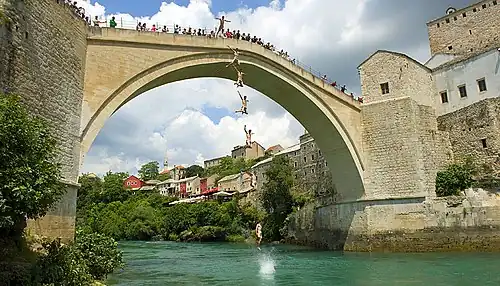 - ↑ Kdysi byl symbolem války, dnes se z mostarského mostu znovu závodí ve skocích do vody. Radiožurnál. Dostupné online [cit. 2023-03-22].