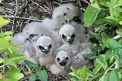 Mláďata jsou po vylíhnutí obalena prachovým peřím. Klubou se postupně v několikadenních intervalech v pořadí, v jakém byla nakladena vejce. V případě, že jim rodiče nedokáží obstarat dostatek jídla, dochází k usmrcení a pozření nejslabšího mláděte jeho sourozenci. Po 4 týdnech jsou mláďata plně opeřená a kolem 6.–7. týdne se začínají osamostatňovat. Absolvují první lety a po další 1–2 týdny se vrací do hnízda za odpočinkem a jídlem, které jim nadále obstarávají rodiče. Poté se plně osamostatňují.[11][8]