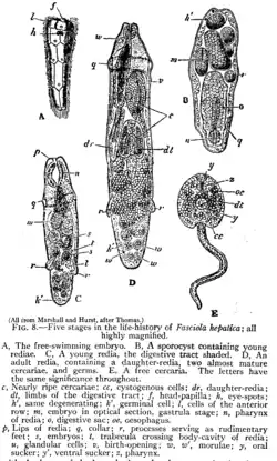 - ↑ Rondelaud D., Vignoles P., Dreyfuss G. Fasciola hepatica: the developmental patterns of redial generations in naturally infected Galba truncatula. Parasitol Res. Říjen 2004, roč. 94, čís. 3, s. 183–7. PMID 15338285.