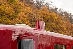 Původní vnější nátěr vozu byl višňově červený s částečným přesahem do střechy, horní část střechy byla v barvě starého zlata a podvozky s koly v barvě návěstní šedi.[17]