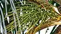 Štíhlá, 20–⁠30 cm dlouhá hroznovitá květenství se před kvetením vyvíjí v ostnitých listenech, vyrůstajích z paždí listů. Květy jsou žluté, převážně samičí, samčí jsou umístěny na koncích hroznů. Opylování významně napomáhá hmyz.
