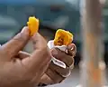 Vnitřní část vrcholu, tedy mladé, nevyvinuté listy, tj. palmové srdce, se podává na způsob zeleniny, např. do salátů.[5]