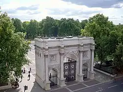 Poté, co byl shledán příliš úzkým pro královský kočár, byl roku 1851 přemístěn na místo kde stojí dodnes. Uvnitř oblouku se nacházejí tři malé místnosti, které byly do roku 1950 používány jako policejní stanice. Některé sochy určené pro jeho výzdobu, především ty, které měly zdobit původní hlavní vstup, byly umístěny na průčelí Národní galerie. Oblouk stál poblíž tyburnského popraviště, místa veřejných poprav v období let 1388 až 1793. Průchod nebo průjezd obloukem je povolen pouze členům královské rodiny a příslušníkům královského jízdního dělostřelectva.[1]