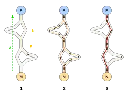 1. První mravenec najde zdroj potravy (F), najde k ní libovolnou cestou (a), potom se vrátí do mraveniště (N) a během cesty vytváří feromonovou stopu.