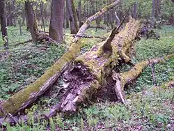 - ↑ Druh dřeviny (z níž pochází mrtvé dřevo) je dominantní kvalitativní vlastností ovlivňující celkový sumární počet druhů organismů vázaných na mrtvé dřevo. Z tohoto pohledu jsou v podmínkách České republiky významnými dřevinami dub letní (Quercus robur) a dub zimní (Quercus petraea). Pro biodiverzitu lišejníků je především ve vyšších nadmořských výškách zásadním stromem javor klen (Acer pseudoplatanus). Dřevo habru (Carpinus), ponechané např. ve stínu, přitahuje v prvních letech rozkladu početně nejvíce na dřevo vázaných brouků. Původní smrk ztepilý (Picea abies) je schopen ve svém mrtvém dřevě hostit více na dřevo vázaných brouků než mrtvé dřevo z nepůvodní douglasky (Pseudotsuga) či modřínu (Larix).[10]