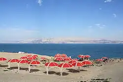 Břehy na západě a východě jsou srázné a skalnaté. Na severu a jihu navazuje na pobřeží táhlá rovina. Pobřeží je převážně pusté, s výjimkou několika oáz a turistických resortů s plážemi pro koupání. U jižního břehu probíhá těžba soli a dalších minerálů, nachází se zde i rozsáhlý chemický komplex pro úpravu vytěžených surovin.