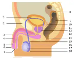 1. močový měchýř, 2. stydká kost, 3. penis, 4. topořivé těleso, 5. žalud, 6. předkožka, 7. ústí močové trubice, 8. tračník, 9. konečník, 10. semenný váček, 11. ejakulační vývod, 12. prostata, 13. Cowperova žláza, 14. anus, 15. chámovod, 16. nadvarle, 17. varle, 18. šourek