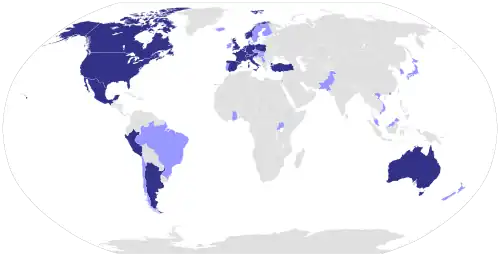 | Rozšíření | Argentina, Austrálie, Belgie, Brazílie, Chile, Česko, Dánsko, Finsko, Francie, Ghana, Hongkong, Irsko, Island, Itálie, Japonsko, Jižní Korea, Kanada, Malajsie, Mexiko, Německo, Nizozemsko, Norsko, Nový Zéland, Norsko, Peru, Polsko, Rakousko, Slovensko, Slovinsko, Španělsko, Spojené království, Spojené státy, Švédsko, Švýcarsko, Turecko, Uganda, Vietnam |