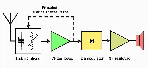 Užitečný vysokofrekvenční amplitudově modulovaný signál se dostal z laděného rezonančního obvodu na řídící mřížku v pořadí první elektronky (P1). Jednalo se o vysokofrekvenční pentodu typu RV2.4P700 (pro bateriové přístroje),[6] která byla zapojena a pracovala jako zesilovač vysokofrekvenčního signálu.[5] K zesílení docházelo ještě před demodulací, což bylo důležité kvůli linearitě signálu před touto demodulací. Z anody A1 první pentody P1 byla zavedena kladná zpětná vazba do vstupního rezonančního obvodu, čímž bylo dosaženo výrazného zvýšení citlivosti a selektivity celého přijímače. Těsnost kladné zpětné vazby (tj. míra pronikání anodového signálu do vstupního laděného obvodu) byla regulována mechanicky ručním nastavovacím prvkem (ovládaným nejspíše z čelním panelu přijímače).