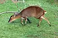V dospělosti dorůstá délky 0,95 m o váze mezi 10 až 18 kg. Samci mají na hlavách malé parohy. Je hnědý.