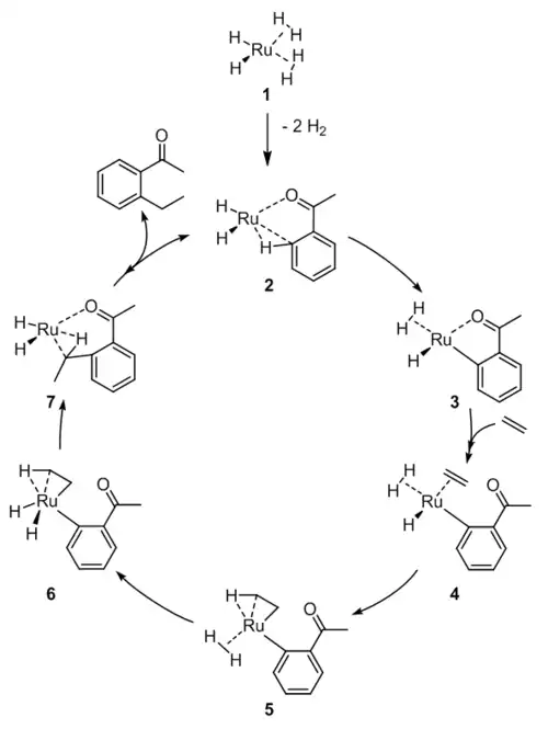 Po vzniku aktivní formy katalyzátoru z 1 se acetofenon koordinuje na komplex přes karbonylový kyslík a agosticky přes ortho-C-H vazbu (2). Podobně jako u mechanismu navrženého pro Ru0 tyto agostické interakce vyvolávají oxidační adici na ortho-C-H. redukční eliminací se uvolní H2, který je stále koordinovaný, a vytvoří se komplex 3. Koordinací ethenu a dekoordinací ketonu vznikne komplex 4, u něhož proběhne navázání ethenu na hydrid za vzniku 5. Po oxidační adici H2 (6) dojde k redukční eliminací a produkt se agosticky naváže na komplex. Koordinací další molekuly acetofenonu dojde k obnovení komplexu 2.