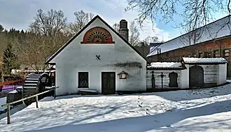 Rekonstrukce objektu s hamerskou dílnou a mlýnicí v letech 1976–1980, včetně technologického zařízení, hamerské kladivo, měch, brus, kovadlina, váha a drobné nářadí přenesené z bývalého vodního hamru (snad z roku 1827) v obci Věžovatá Pláně (okres Český Krumlov), krupník-holendr z bývalého mlýna Mezný[39] v Kovářově u Seče (obec Bojanov) a složení jahelky z mlýna Bětník[40] z Popovce (obec Řepníky).[8]