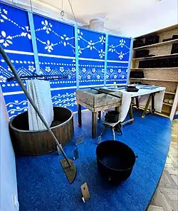 Tkalcovský cech byl jedním z prvních a nejstarších ve městě, proto je tomuto řemeslu věnována další z expozic. Tkalcovství přinášelo obživu většině obyvatel Frenštátu a jeho okolí. Je zde prezentována jedinečná sbírka sedmi ručních tkalcovských stavů a nástrojů na přípravu příze. Návštěvník se může seznámit s výrobou plátna od zpracování lnu až po hotový výrobek a zájemci si mohou vyzkoušet tkaní na interaktivním tkalcovském stavu. Druhá část expozice je věnována barvířství a návštěvník tak může nahlédnout do dílny na výrobu modrotisku, který byl pro zdejší kraj typický. Vše doplňuje soubor ručních i strojových tiskařských forem, vzorníků látek a textilií. Součástí expozice jsou cechovní památky, fotografie, písemnosti a školní učebnice.[3][12]