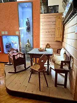 Expozice nabízí pohled do života vesnických rodin, přesněji na lidové, ale i umělecké projevy Frenštátska na přelomu 19. a 20. století a je rozdělena do tematických celků: Vánoce, Velikonoce, poutě, světci a čeští zemští patroni. Jsou zde vystaveny plastiky a podmalby na skle od anonymních tvůrců doplněné o autorská díla většinou z 2. poloviny 19. století. Velkou část expozice zaujímá tzv. svatý kout se stolem, lavicí a kolébkou, který umožňuje udělat si představu, jak vypadalo vybavení tehdejších domácností. Celek doplňují předměty denního užívání (např. máselnice, džbány, jařmo), práce místních amatérských řezbářů, dětské hračky, ale také výšivky. Zajímavostí je malovaný dřevěný houpací koník od Františka Kaděry vytvořený podle návrhu architekta Dušana Jurkoviče.[3][11]