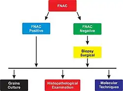 Ahmed a kol. v roce 2017 vypracovali schéma doporučeného postupu diagnostiky. Při negativním výsledku FNAC se využívá chirurgická biopsie pro získání granul. Následně se využívají přesnější metody dle možností laboratoře.[18]