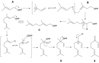 V přírodě terpeny vznikají dehydratací geraniolu. Biosyntéza myrcenu v rostlinách probíhá přes geranylpyrofosfát (GPP). V mevalonátové dráze vznikají prekurzory dimethylallylpyrofosfát (A) a isopentenylpyrofosfát (B). Tyto dvě molekuly se spojí za vzniku geranylpyrofosfátu (C), který se následně izomerizuje na linalylpyrofosfát (D). Poté přesmykem a odštěpením pyrofosfátové skupiny vzniká myrcen (E).[5]