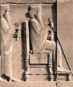 Z kultur Mezopotámie se kvůli špatným klimatickým podmínkám kolem řek Eufrat a Tigris nedochovaly v podstatě žádné konkrétní památky připomínající nábytek. Základní informace o tvaru, vzhledu a využití nábytku se dochovaly na reliéfech, hliněných deskách a pečetních válečcích. Předměty a nábytek zobrazený na reliéfech vlastnila pouze vysoko postavená společnost.[1] Muži jedli v leže, ženy zase vsedě.