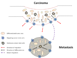 Nedávné studie podporují teorii, že nádorové buňky, u kterých proběhl proces EMT, mohou být prekurzory pro metastazující buňky, nebo dokonce metastazující CSC.[40] Na periferním okraji nádoru pankreatu byla identifikována populace buněk CD133+CXCR4+ (receptor pro chemokine CXCL12 známy také jako SDF1 ligand). Tato subpopulace vykazovala silnou migrační aktivitu na rozdíl od populace buněk CD133+CXCR4−, i když obě populace měly schopnost iniciovat rozvoj a metastazování nádorů.[41] Inhibice receptoru CXCR4 navíc vedla k redukci metastického potenciálu.[42]