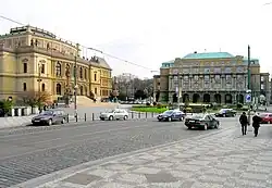 ![]() Pohled na náměstí Jana Palacha z budovy Filozofické fakulty Univerzity Karlovy s Mánesovým mostem na Malou Stranu a Pražský hrad na horizontu | |||