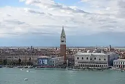 Pohled od jihu: zvonice, Dóžecí palác a molo zakončující náměstí