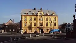 Náměstí Svobody v Zákupech s radnicí, sousoším Nejsvětější Trojice a muzeem Eduarda Helda | |