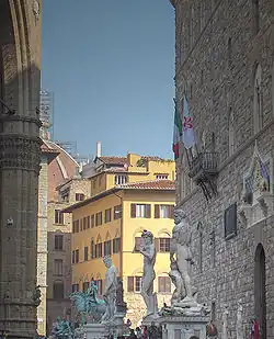Dominantami náměstí jsou Palazzo Vecchio a Loggia dei Lanzi.