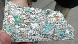 Kousek desky z materiálu Flexibuild vyrobený recyklací nápojových kartonů. Vyrábí ho Flexibuild s.r.o, Hrušovany u Brna, Česko. Materiál se používá na stavbu rodinných domů.