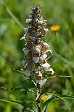 Lodyha přechází v husté hroznovité květenství dlouhé 30 až 60 cm, které může mít sto i více květů, jež jsou 2 až 3 cm dlouhé, pětičetné, oboupohlavné a střídavě otočené do všech stran. Protandrické květy vyrůstají na krátkých chlupatých stopkách v úžlabí listenů. Kalich je až k bázi členěný v nestejně dlouhé cípy, jež jsou kopinaté a na konci ostře špičaté. Zvonkovitá, nevýrazně dvoupyská koruna je světle žlutá až bělavá s hnědou žilnatinou, uvnitř je dlouze brvitá. Její korunní trubka, dlouhá 18 až 25 mm, je v polovině délky zaškrcená, spodní část je úzká a horní kulovitě nafouknutá. Kratší horní pysk je nezřetelným dvojlaločný, výrazně delší dolní pysk je třílaločný, má 8 až 13 mm dlouhý zahnutý, bělavý střední lalok, dva boční laloky jsou krátké, stejně jako u horního pysku. Tyčinky se žlutými prašníky čnící z koruny jsou čtyři, dvě přední jsou delší, nitky všech jsou vespod ke koruně přirostlé. Svrchní semeník s mnoha opačně otočenými vajíčky nese čnělku, obvykle není delší než korunní trubka a je zakončena dvouramennou bliznou. Květy, nakvétající postupně od spodu, opylují hlavně čmeláci a větší včely. Po opylení květní koruna opadá a je již vidět drobná tobolka. Květy jsou opylovány pylem z cizích květů, protože pyl v prašnících je zralý dřív, než vajíčka v semeníku.