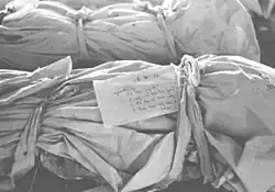 Štítek na zahalených pozůstatcích neidentifikovaných až 6000 obětí, zavražděných při masakru v Hue, spáchaného během války ve Vietnamu příslušníky ozbrojených sil Vietkongu a Vietnamské lidové armády