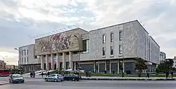 Budova muzea je především známa jako symbol komunistické minulosti země; její průčelí zdobí ohromná mozaika Josifa Droboniku s třinácti stylizovanými Albánci, kteří mají reprezentovat historický vývoj země. Jedná se o následující postavy: