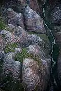 Nezvyklé oranžové a tmavě šedé vodorovné pruhy na kónických skalních útvarech jsou způsobené rozdílnými uloženými materiály.Tmavší pásy jsou nasákavější horniny jímající více vlhkosti a rostou v nich řasy a sinice. Oranžově zbarvené vrstvy jsou obarveny kysličníky železa a manganu z blízkých ložisek nerostů.