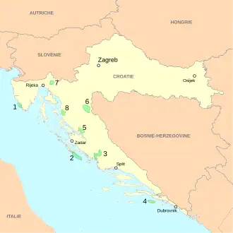 | Národní park Kornati | Nacionalni park Kornati | 1980 | 218 km² | Jedná se o národní park severní Dalmácii, rozkládající se na souostroví Kornati v Jaderském moři nedaleko měst Šibenik a Zadar. Souostroví se skládá ze 109 ostrovů a ostrůvků. Ostrovy nejsou trvale osídleny, jsou však oblíbeným cílem turistů, přestože pohyb chodců na ostrovech a lodí v okolí ostrovů je velmi přísně omezen. | OSM, WMF | |